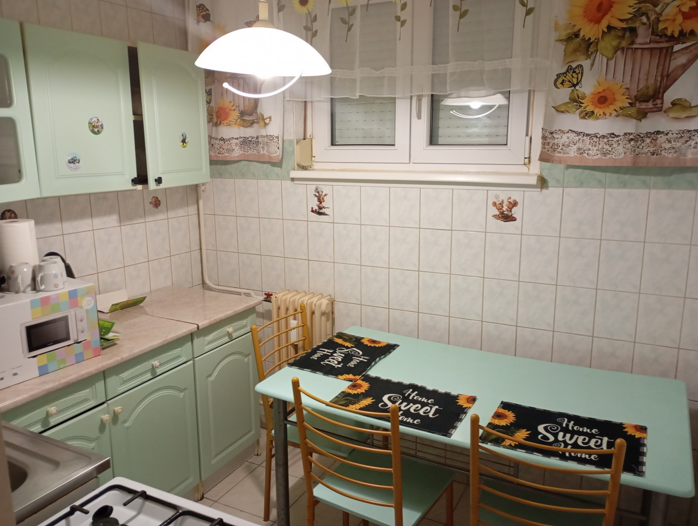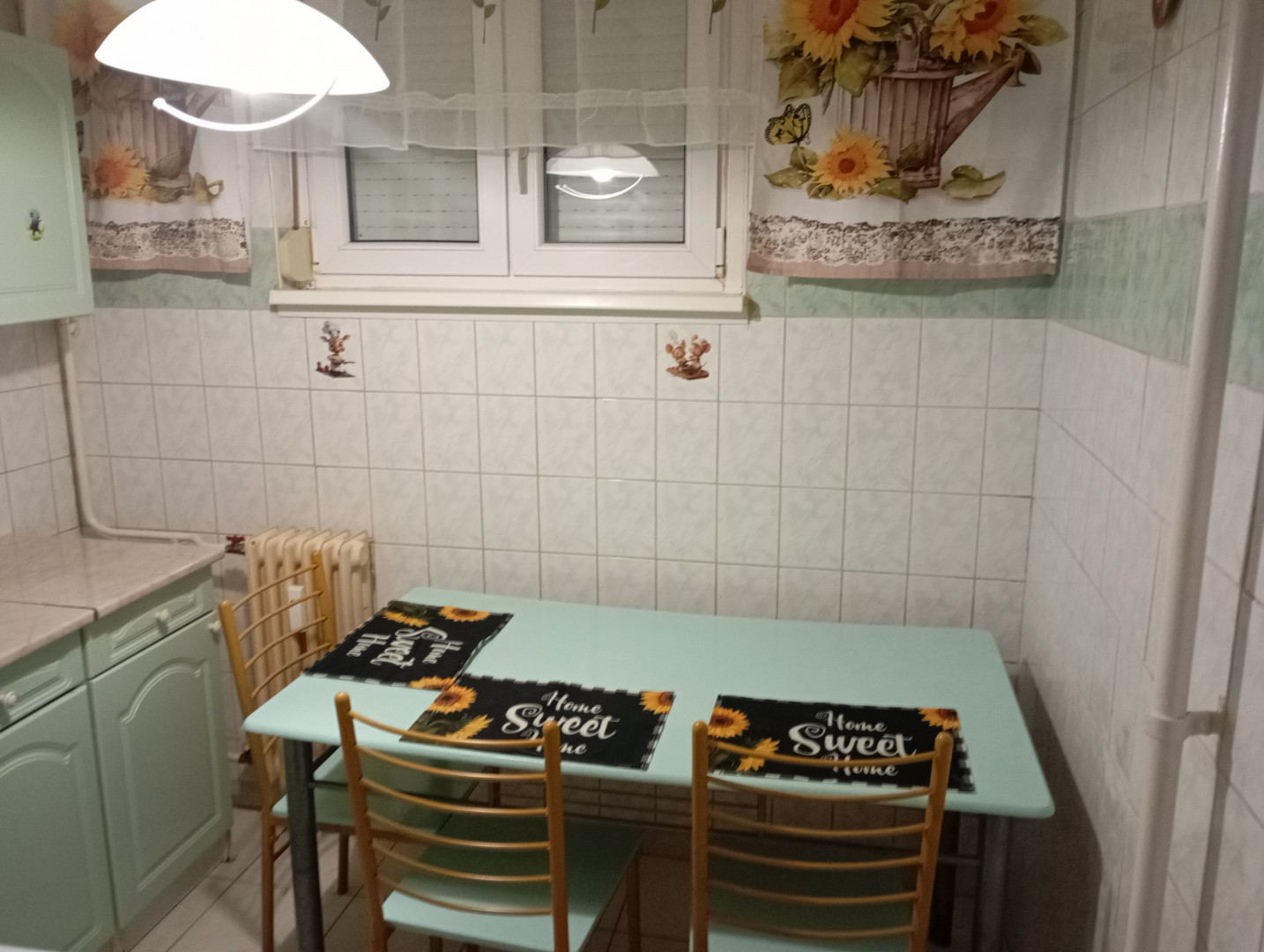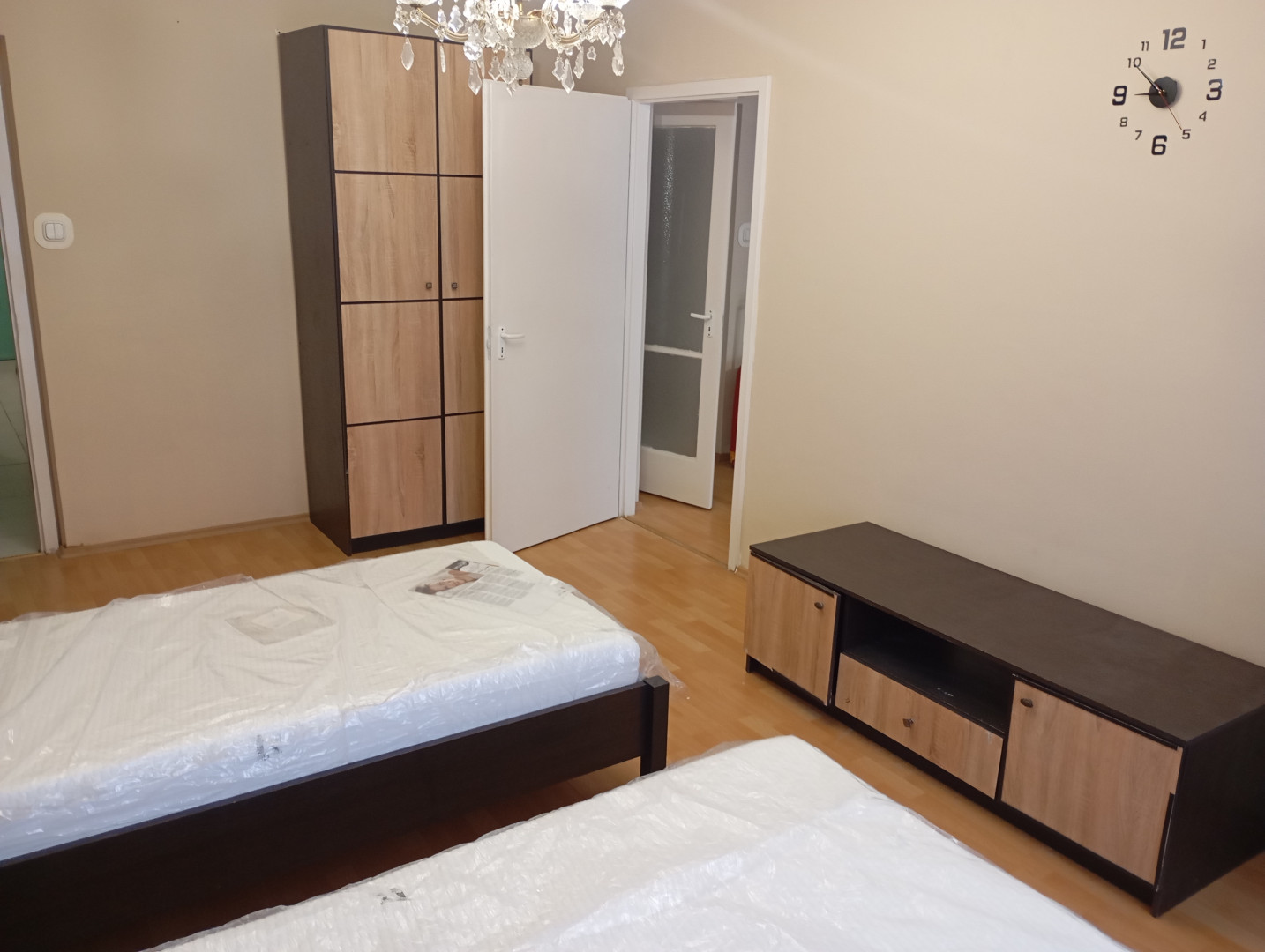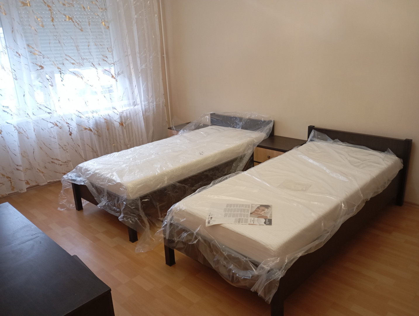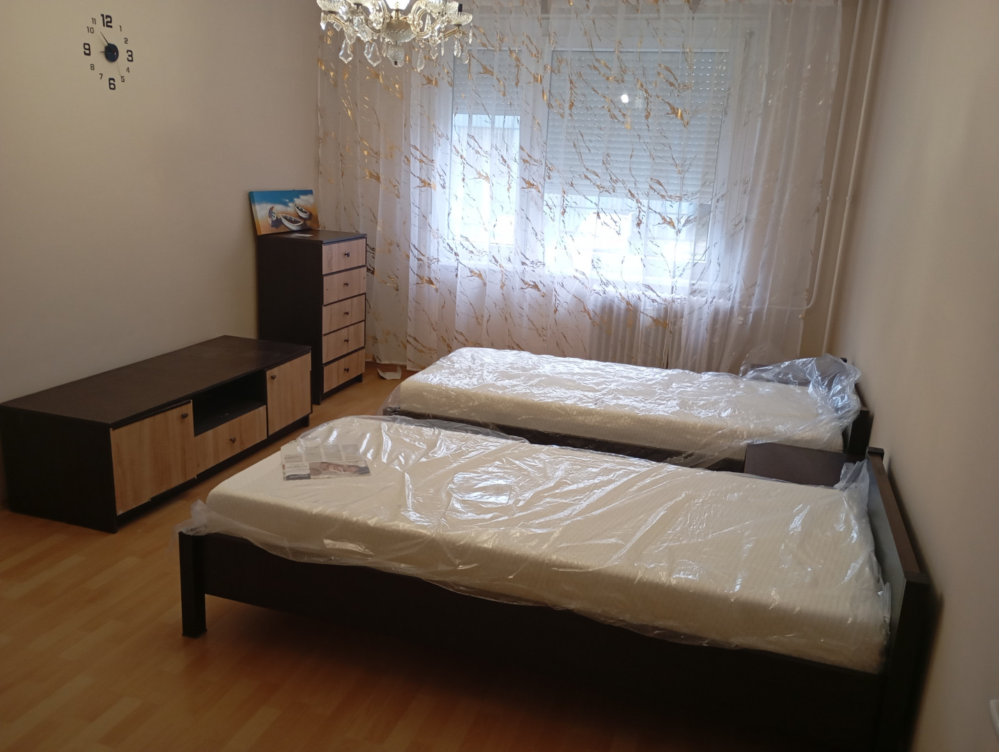 A lakás frissen festett, 2 szobás, bútorozott, vadonatúj ágymatracokkal ellátva, van egy kis kamra, fürdő-wc külön, a konyha felszerelt.
