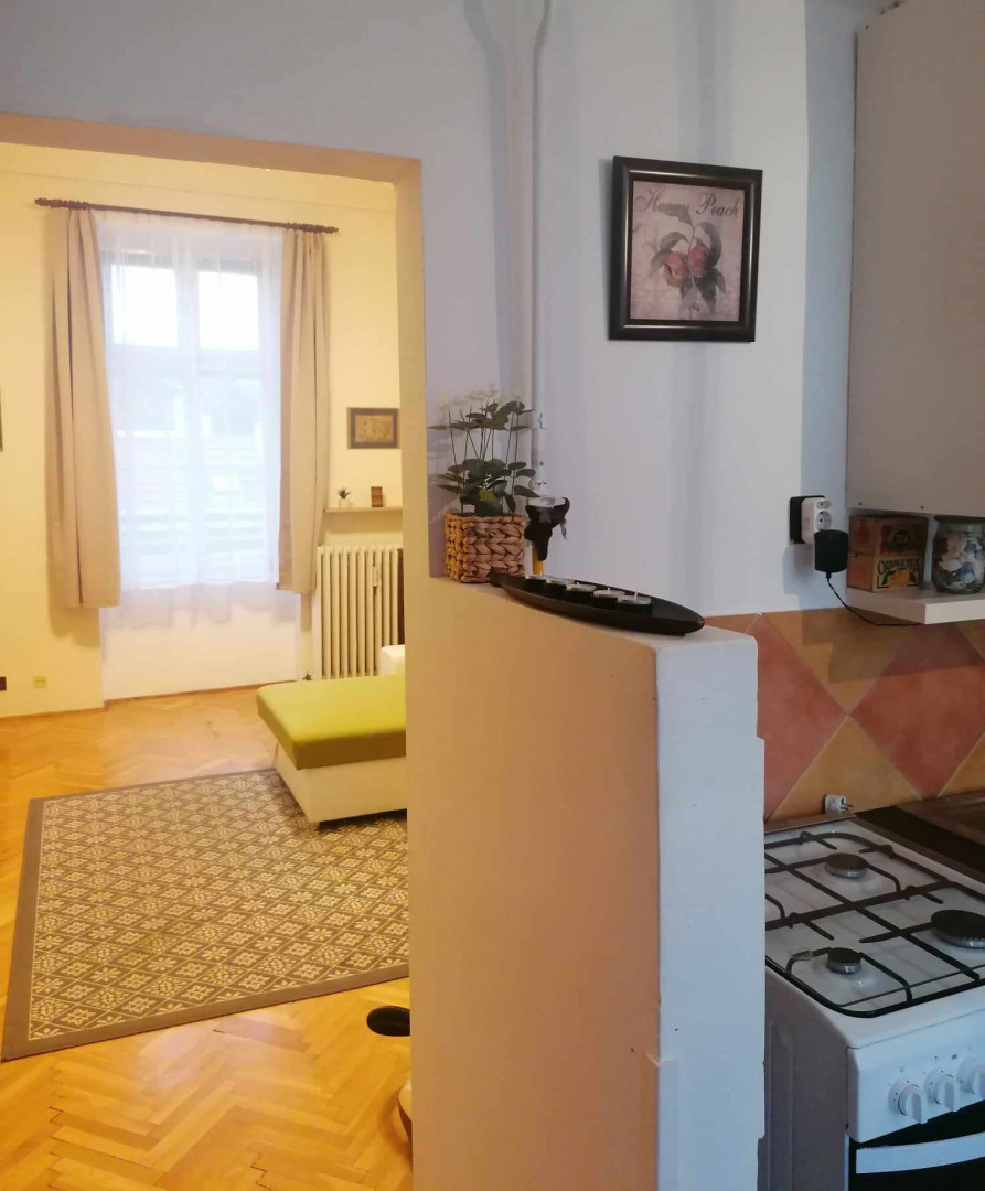 Debrecen belvárosában színházzal szemben,Batthyány utca sarkán első emeleti, másfél szobás lakás kiadó.